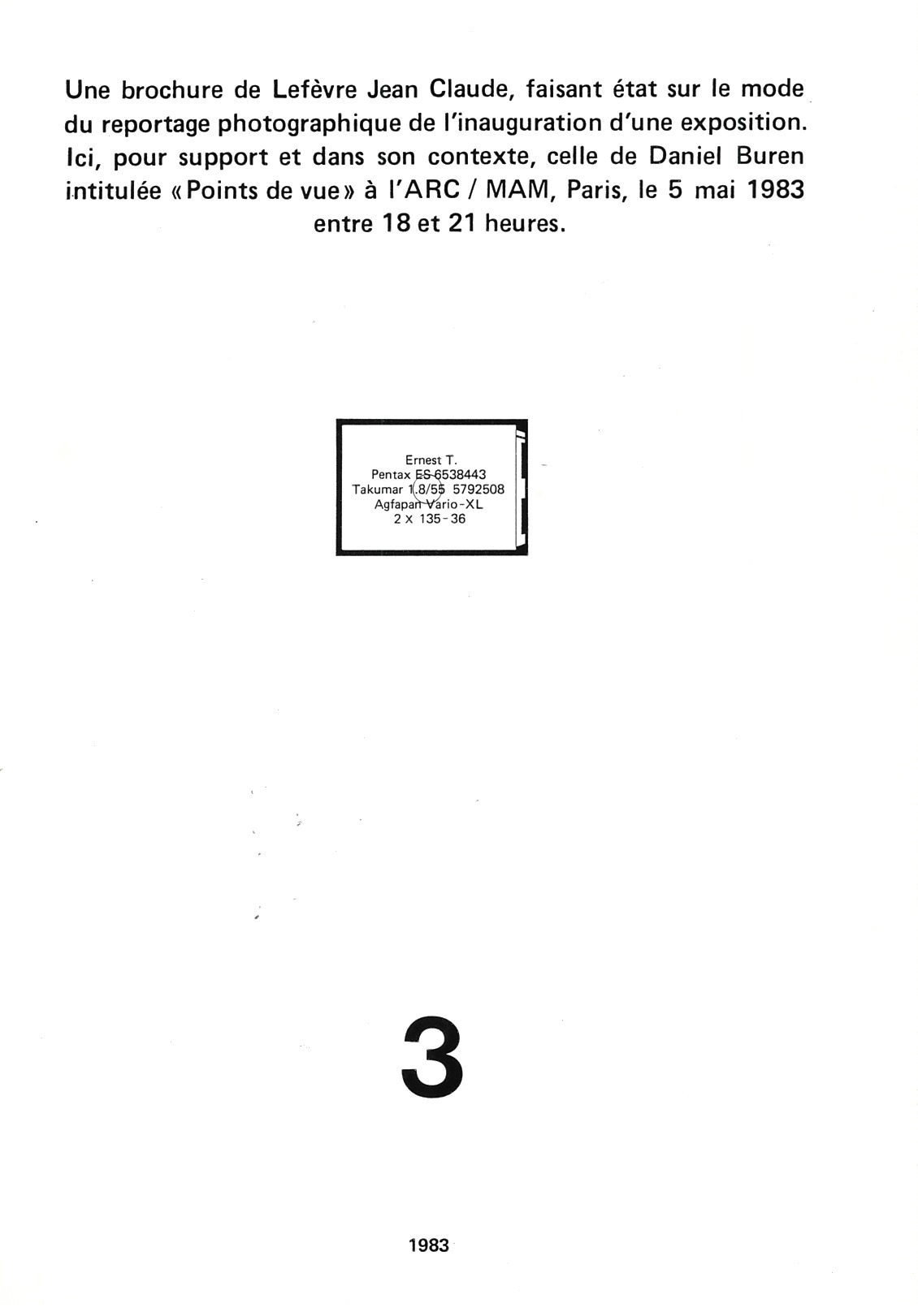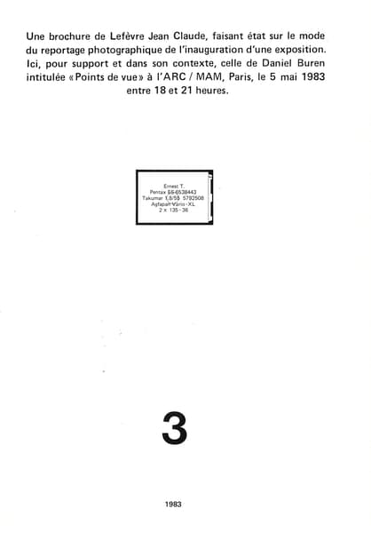 Une brochure de Lefèvre Jean Claude, faisant état sur le mode du reportage photographique de l’inauguration d’une exposition. Ici, pour support et dans son contexte, celle de Daniel Buren intitulée « Points de vue » à l’ARC / MAM, Paris, le 5 mai 1983 entre 18 et 21 heures. 3, 1983