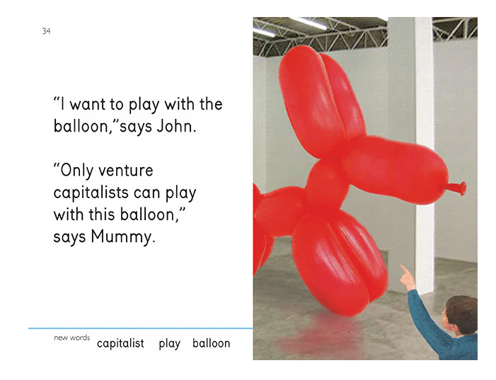 The jolly, colourful illustrations will enable the child to smoothly internalise all of the debilitating middle class self hatred contained in each artwork. New words on every page also help the child to identify the concepts, so that they may repeat them at dinner parties and impress educated guests.