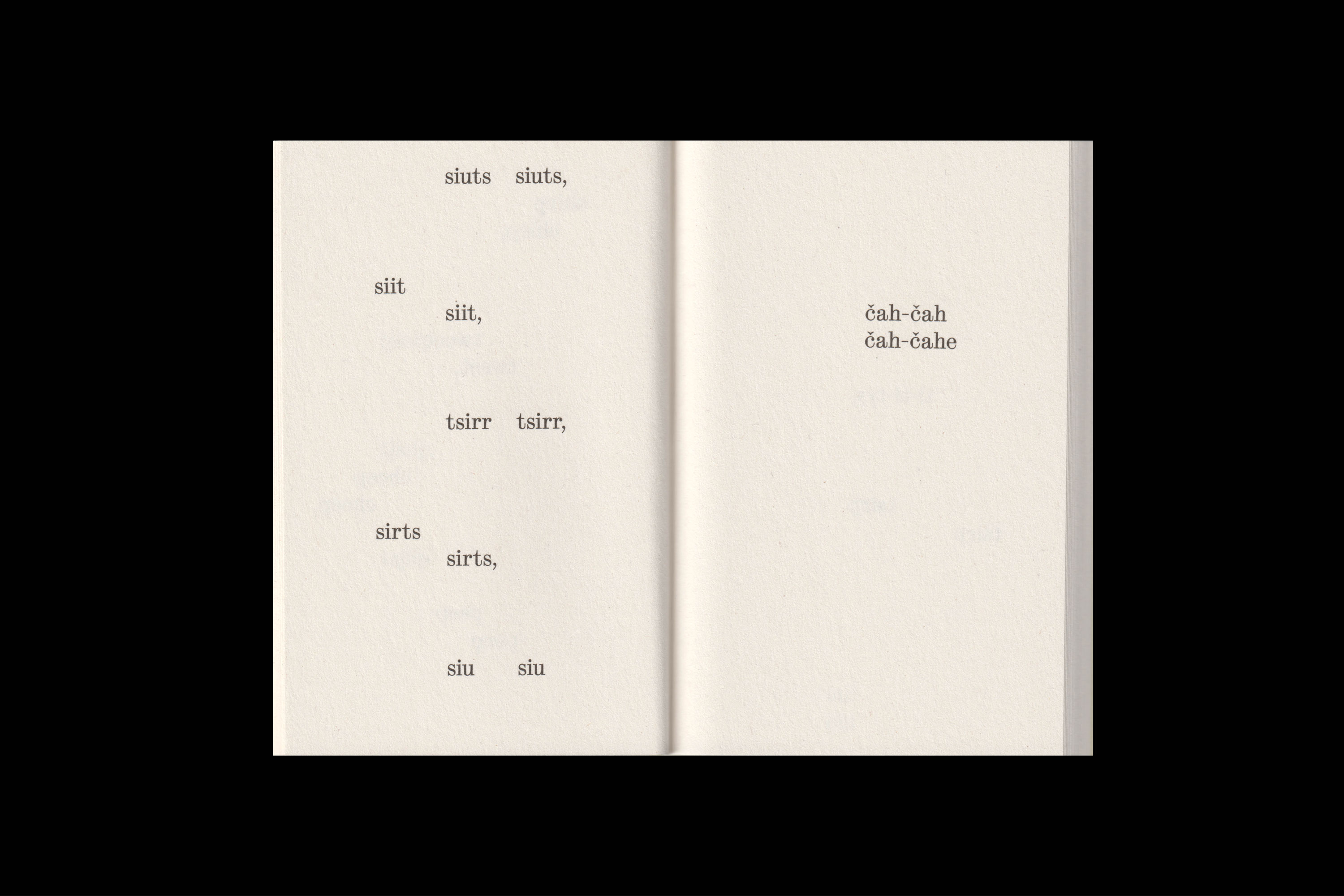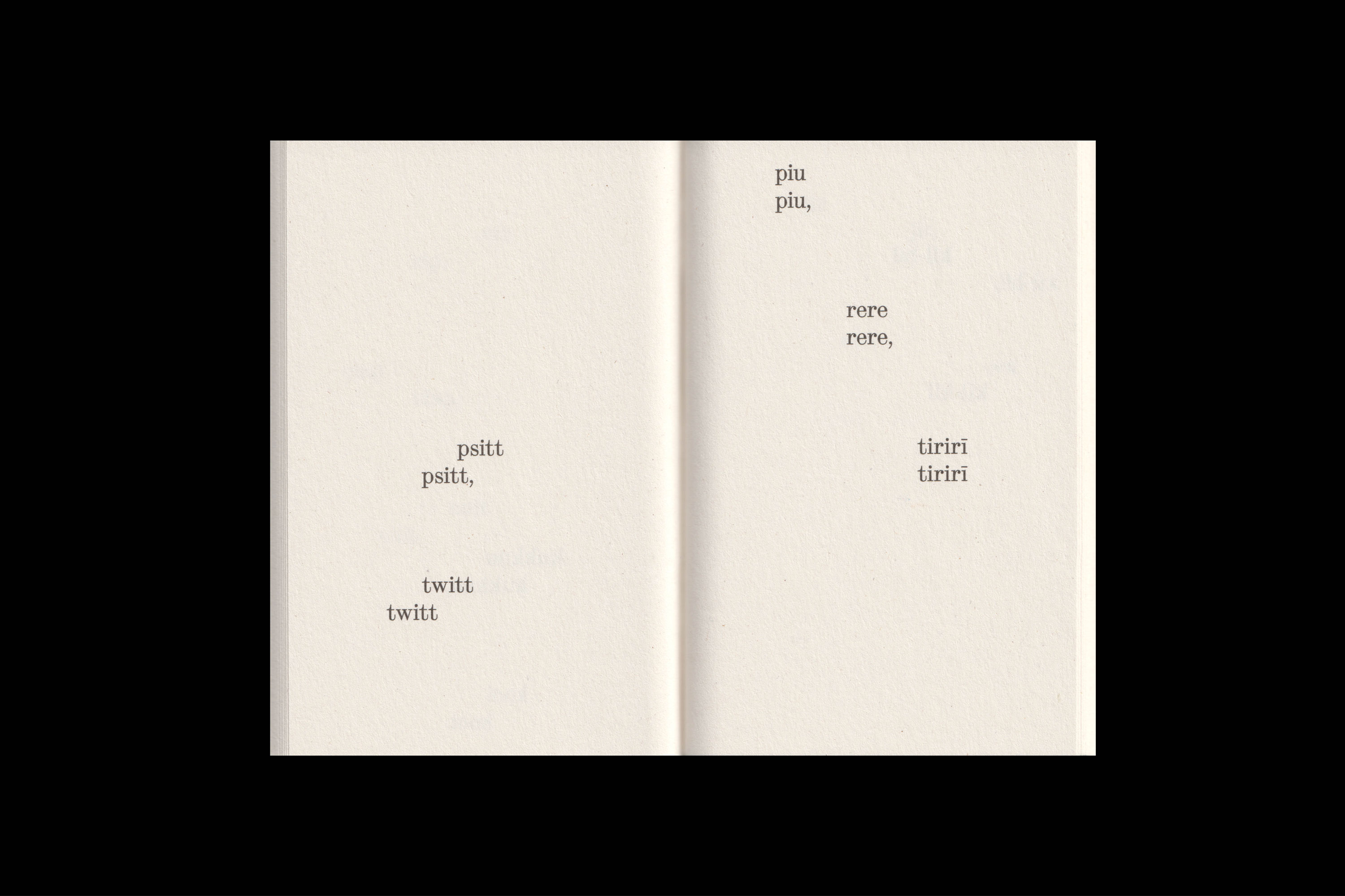 “What Birds Say” assembles attempts to mimic bird songs in writing across 64 languages, compiled from dialogues with different native speakers. Side by side, these abstract word sequences from around the world unfold a poetry of their own – clumsy and charming at once, saying less about birds than about our longing to grasp the world in language. A dadaistic chorus of onomatopoeia that may connect us all to singing birds.
