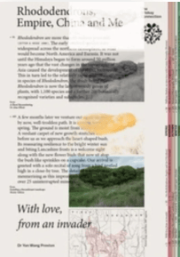 With Love. From an Invader. celebrates the life and resilience of the rhododendron. The book creates space to contemplate the intimacy, beauty, and strength of nature, and the eternity of time within an ecological and political framework. It is a love letter from a non-native species to the cosmopolitan ecology of contemporary Britain. It is also a love letter to the British land from its non-native inhabitants who make it a home for its multicultural residents, both human and non-human.