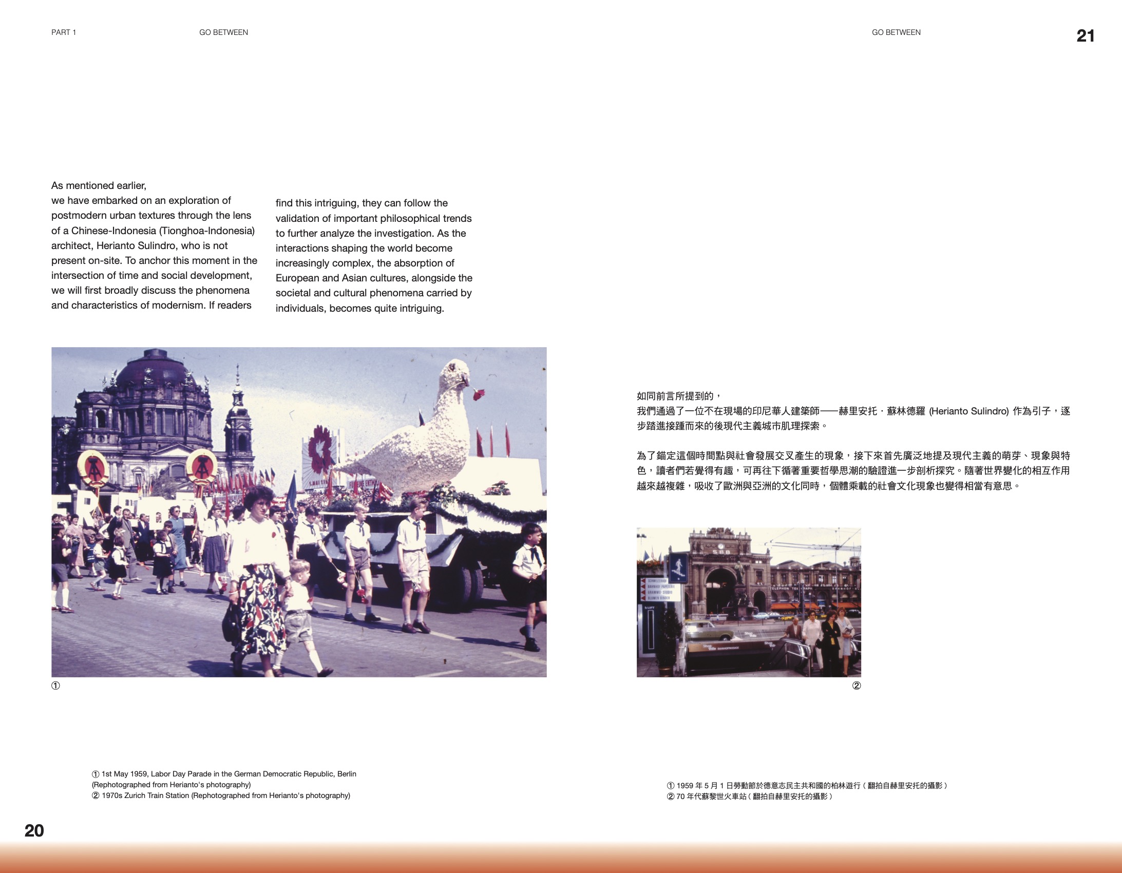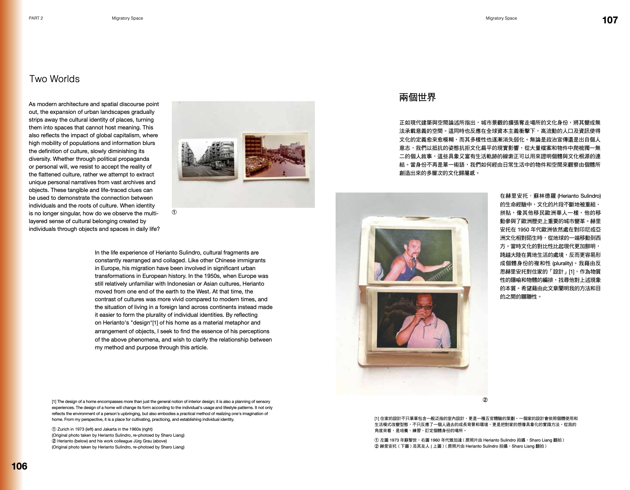 Working in Progress: Reimagine the Identity of Urban Spectrum explores the archival works of Berlin-trained architect Herianto Sulindro (Indonesia, b.1928 - ), who completed his studies in Germany, worked as an architect for 30 years in Zurich. Intersecting perspectives from a daughter, an architectural photographer, a migrant Chinese researcher, and a Southeast Asia-focused curator, the project delves into urban landscapes, nature, Chinese-Indonesian migration, and Zurich’s historical development, interwoven with family history and personal narratives. Together, this book reflects on the cultural dynamic and spatial texture generated by contemporary Asian identities in Western contexts from Herianto’s life journey, to discover the feasibility of future narrative.