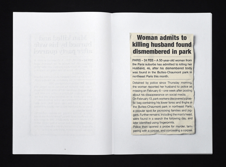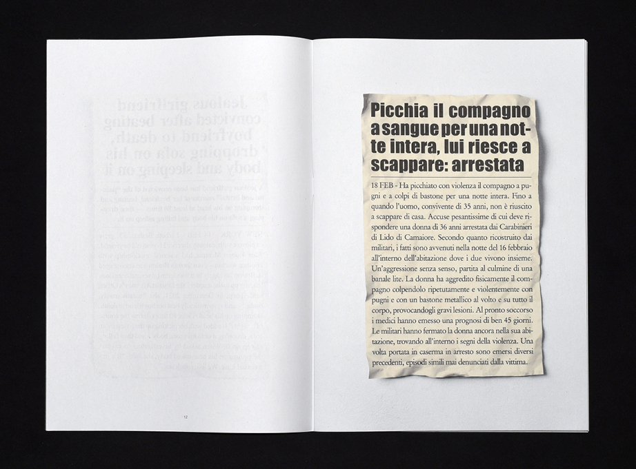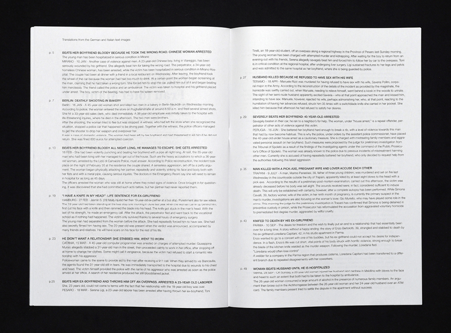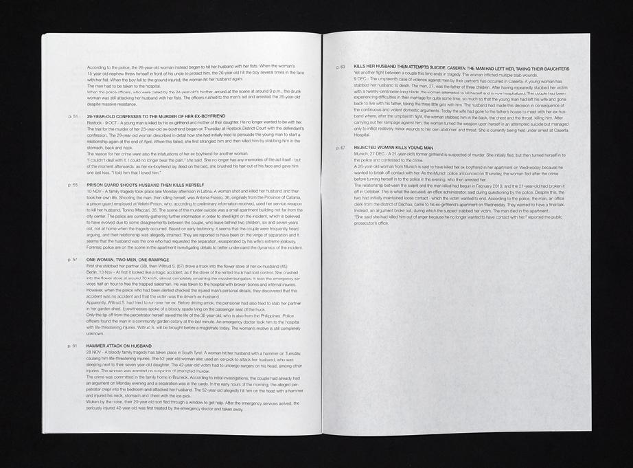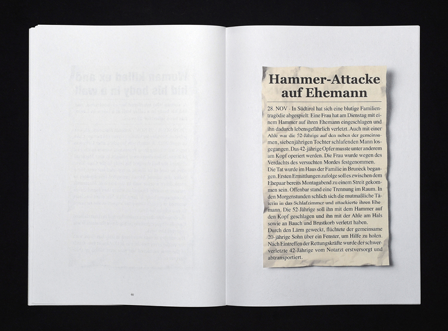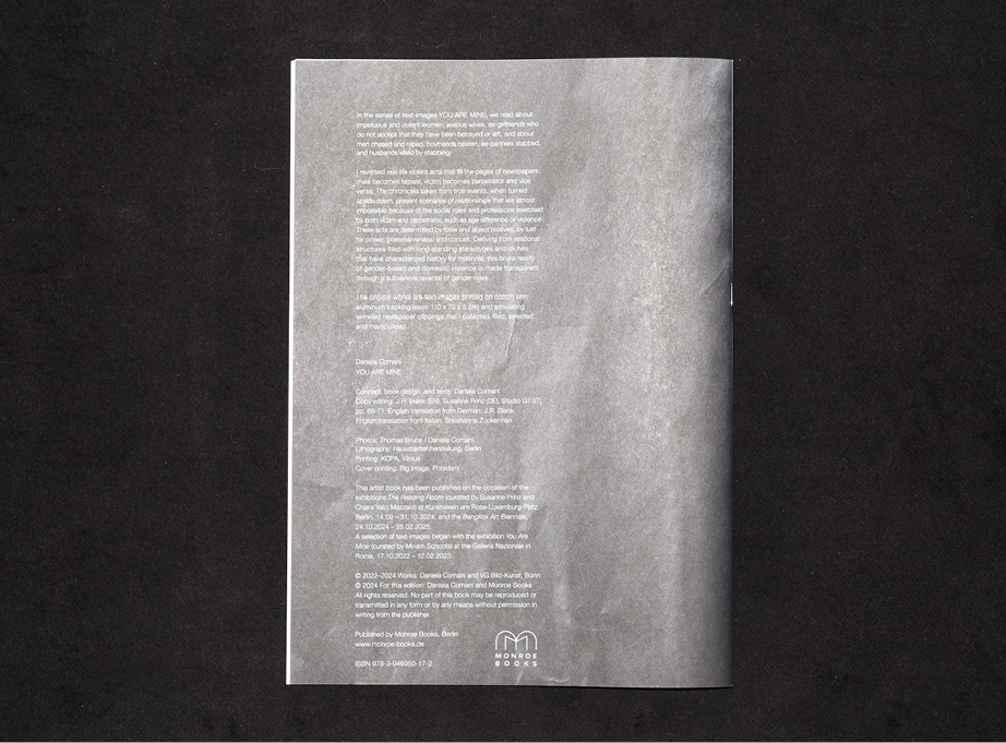 The artist book YOU ARE MINE presents Daniela Comani’s eponymous series of wall pieces which are printed on cotton with an aluminum background simulating wrinkled newspaper clippings. They continue her research into femicide. The work draws on brief press reports about domestic violence and violent relationship crimes. Both, the artist book and the text- images, invite the viewer to experience how a simple gender conversal of the crime protagonists dramatically changes the narrative: Male becomes female, victim becomes perpetrator and vice versa. The work incorporates articles in German, Italian and English. It highlights the urgency of the issue, revealing it as a pressing problem right on our doorstep.