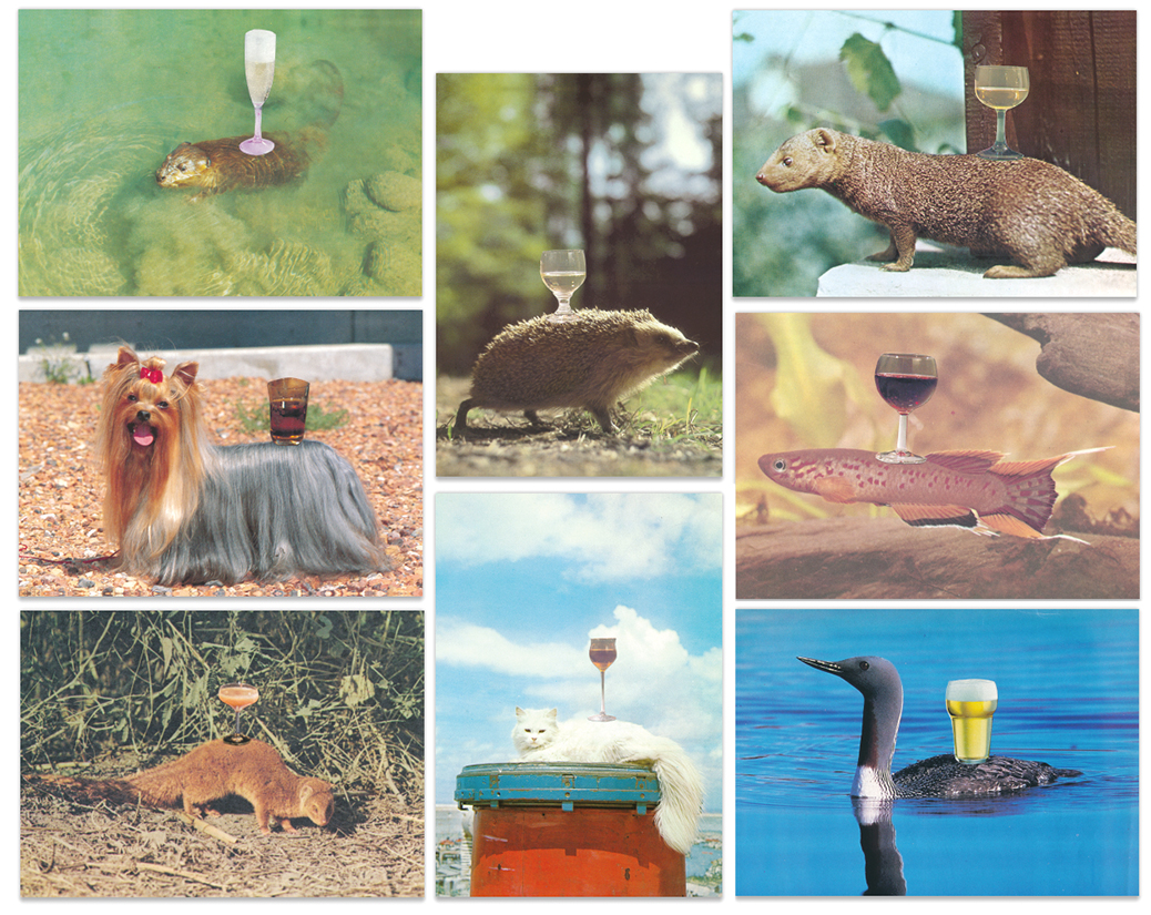 8 postcards with collages from the book YOU RUN AROUND TOWN LIKE A FOOL AND YOU THINK THAT IT'S GROOVY.